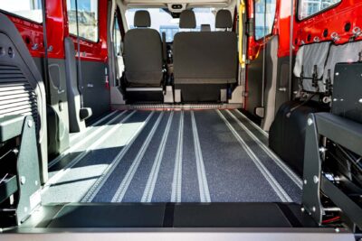 Für die Sicherheit im Fahrbetrieb sorgen geprüfte Einzelsitze und spezielle Gurtsysteme zur Rollstuhlbefestigung. Zusatzblinkleuchten und zusätzliche LED-Innenraumleuchten verbessern die Sichtbarkeit und sorgen für mehr Sichtbarkeit. Der Speedfloor-Multifunktionsboden, kombiniert mit Airline-Schienen und Riffelblech bietet eine robuste und vielseitige Grundlage.